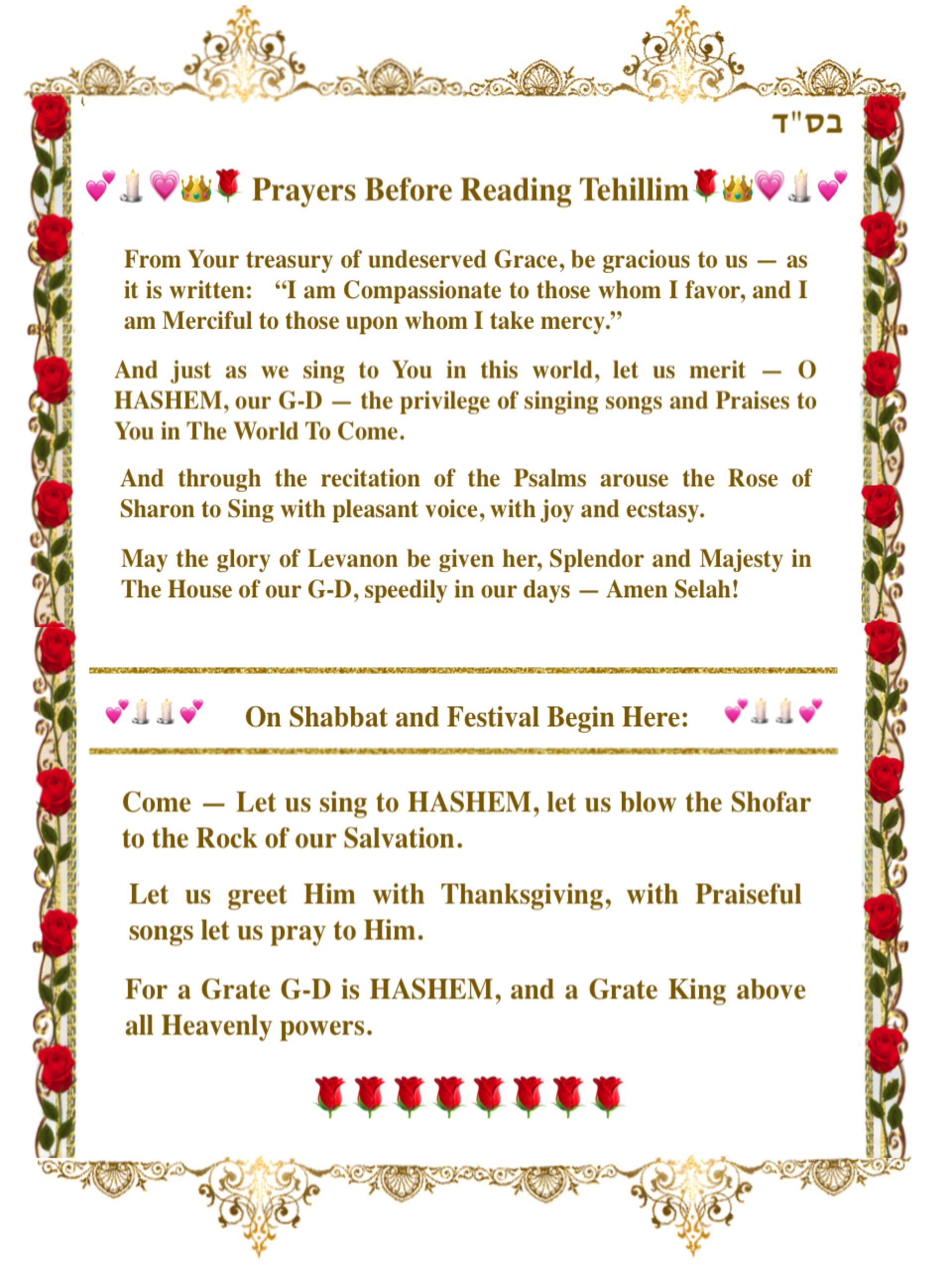Many of the Psalms were composed to be sung by the Levites in the Temple with musical accompaniment, and such Psalms generally begin by naming the instrument upon which they would be played. A few of the Psalms are attributed to authors other than David, have been the son’s of Korach. Whatever the authorship of the Psalms, one thing is certain: Since the day it was composed, the Book of Psalms has become interwoven with the souls of countless Jews. the Psalms are part of the daily Prayers. They are recited at moments of illness and crises. the are chanted Joyously in times of good fortune and when heartfelt prayers have been answered. The last verse of the Book proclaimes: Let all souls Praise G-D, Hallelujah!