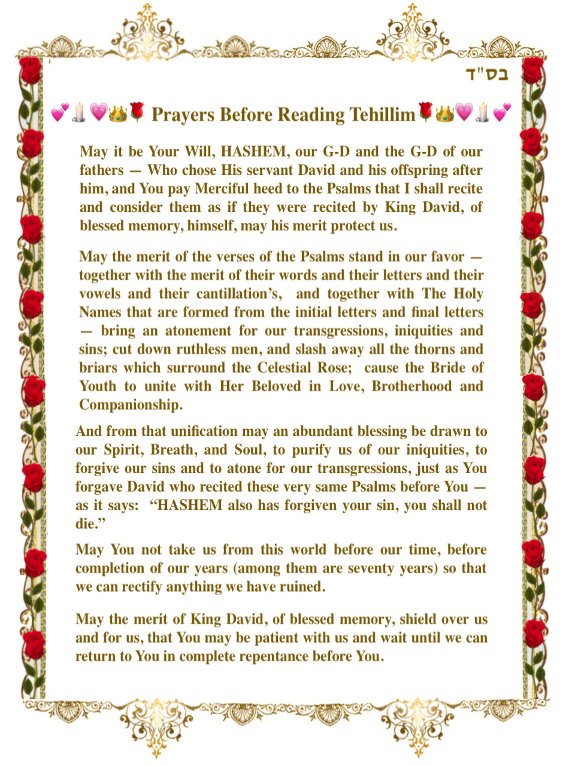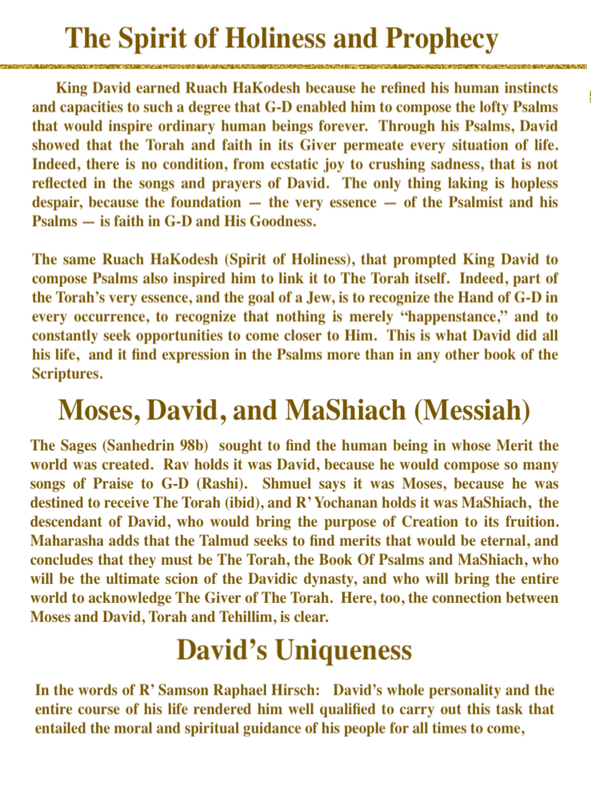 For nearly three thousand years, every situation in a Jew’s life has been reflected in King David’s Book of Psalms. Referring to this Book, G-D said to David, “One day of your songs and praises are more precious to Me than the thousands of offerings that will be brought by your son Solomon.” In illness and in strife, in triumph and in success, the Jew opens his Book of Psalms and lets David become the harp upon which his own emotions sing or weep. Small wonder that when the Chofetz Chaim, as an old man, was presented with his mother’s ancient Book of Psalms, its pages swollen with her lifetime of tears, he was overcome with emotion. Who can assess the worth of the little Book that has been the chariot bearing countless tears to the Heavenly Throne?